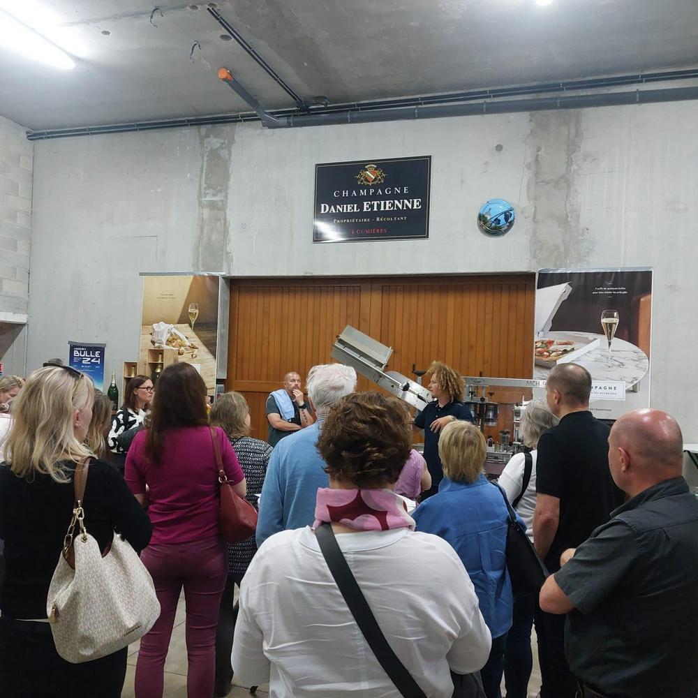 Seuraava pysäkki olikin jo Etiennen samppanjatalo, joka on pieni perheyritys, mutta juuri sopivan iso meidänlaisellemme ryhmälle. Talo sijaitsee Cumières:in pikkukylässä, jossa on monta samppanjataloa vieri vieressä. Samppanjakellarin esittely sujui mukavasti Louis-Marie Etiennen johdolla englanniksi, kun taas isä Daniel Etienne johdatti ryhmämme kolmen samppanjan maisteluihin. Tilalla tuotetaan n. 40 000 pulloa vuodessa, joten tuotanto on pienimuotoista, mutta selvästi hyvin ammattimaista.