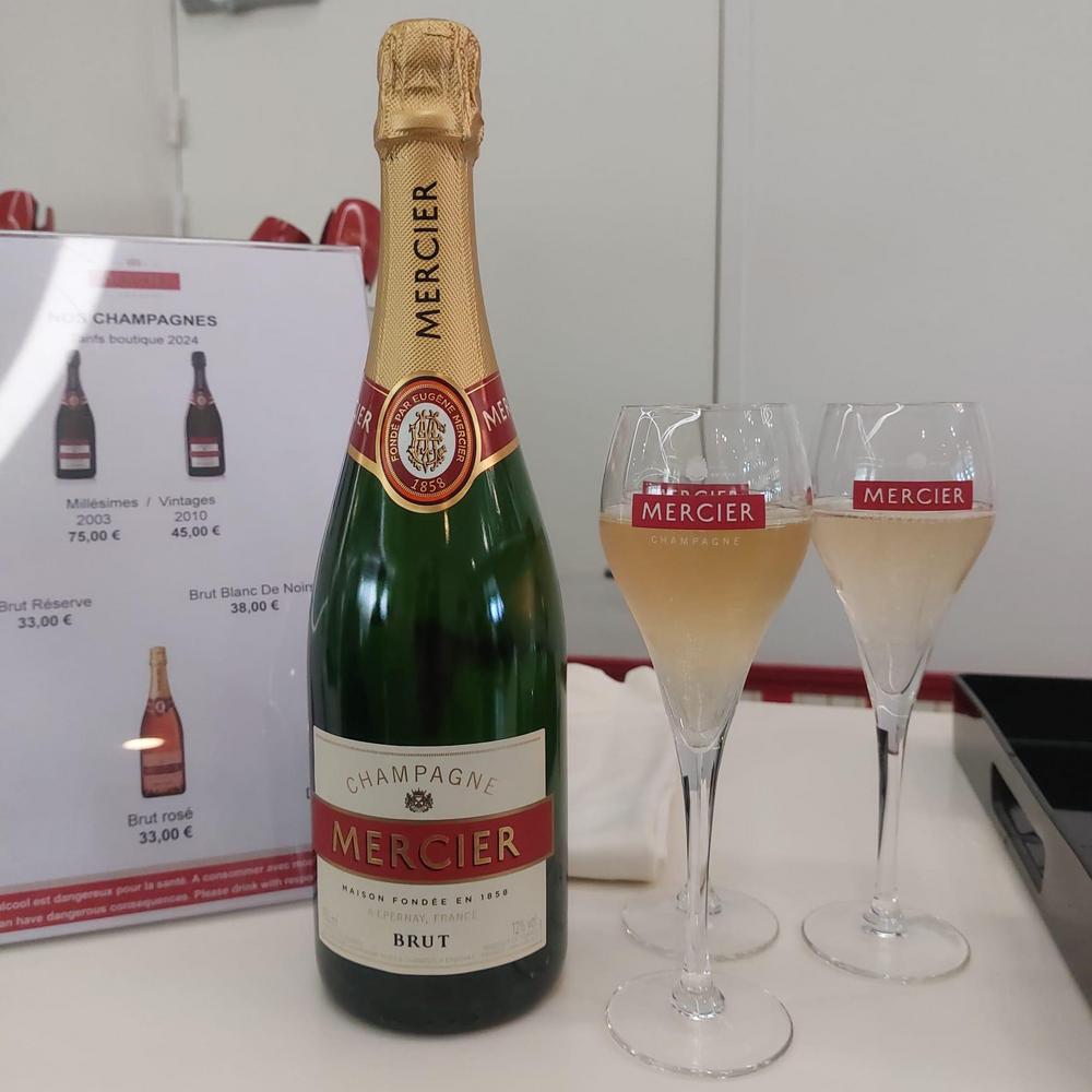 Ostosten teon jälkeen bussi suuntasi takaisin Épernayhin ja suureen Mercier:in samppanjataloon, joka tuottaa yli miljoonaa pulloa samppanjaa vuodessa. Vaikka joukkomme oli hiukan aikataulusta myöhässä onnistuimme saamaan sovitusti kaikki ohjelmaan kuuluvat osat, mukaan lukien jännittävän junamatkan Mercier:in samppanjakellarissa 60 metriä talon alapuolella. Tämän jälkeen seurasi kolmen samppanjan maistelut (Golden Bubble Tour) sommelierin johdolla. Siinä vaiheessa koko matkaseurueella oli jo ranskalainen samppanjasanasto hyvin hallussa, joten oli helppoa seurata sommelierin ruokavinkkejä ja ehdotuksia eri samppanjoille.